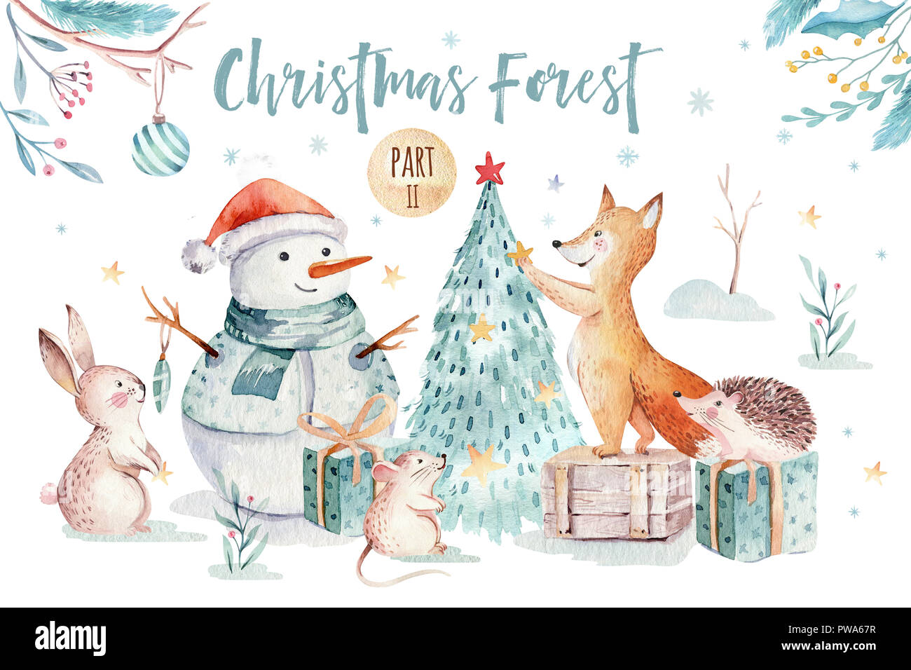 Aquarell Frohe Weihnachten Abbildung Mit Schneemann Weihnachtsbaum Urlaub Susse Tiere Fuchs Hase Und Igel Weihnachtsfeier Karten Wi Stockfotografie Alamy