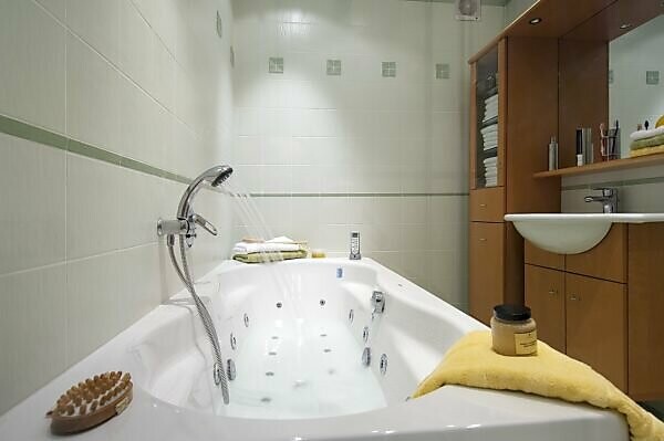Bildagentur Mauritius Images Badezimmer Whirlpool Badewanne Dusche Wasser Fliessen Handtucher Peelingsalz Burste Fernbedienung Bad Modern Exklusiv Ausstattung Einrichtung Edel Badezimmermobel Holzmobel Handwaschbecken Waschbecken