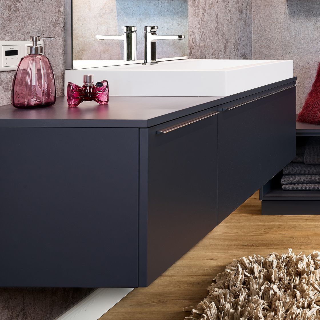 Das Farbkonzept des Bads lässt sich abseits von Möbeln Keramiken Armaturen und Fliesen mit Dekorationen und Accessoires abrunden.